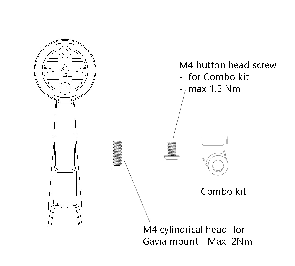 - You can now install the combo kit on the bottom of the Gavia mount if needed. Use the button head screw (V1) or the countersunk head screw (V2). The pin of the Stelvio mount must face the handlebar. Other position doens’t work and screw doens’t match with the insert of the Carbon body.